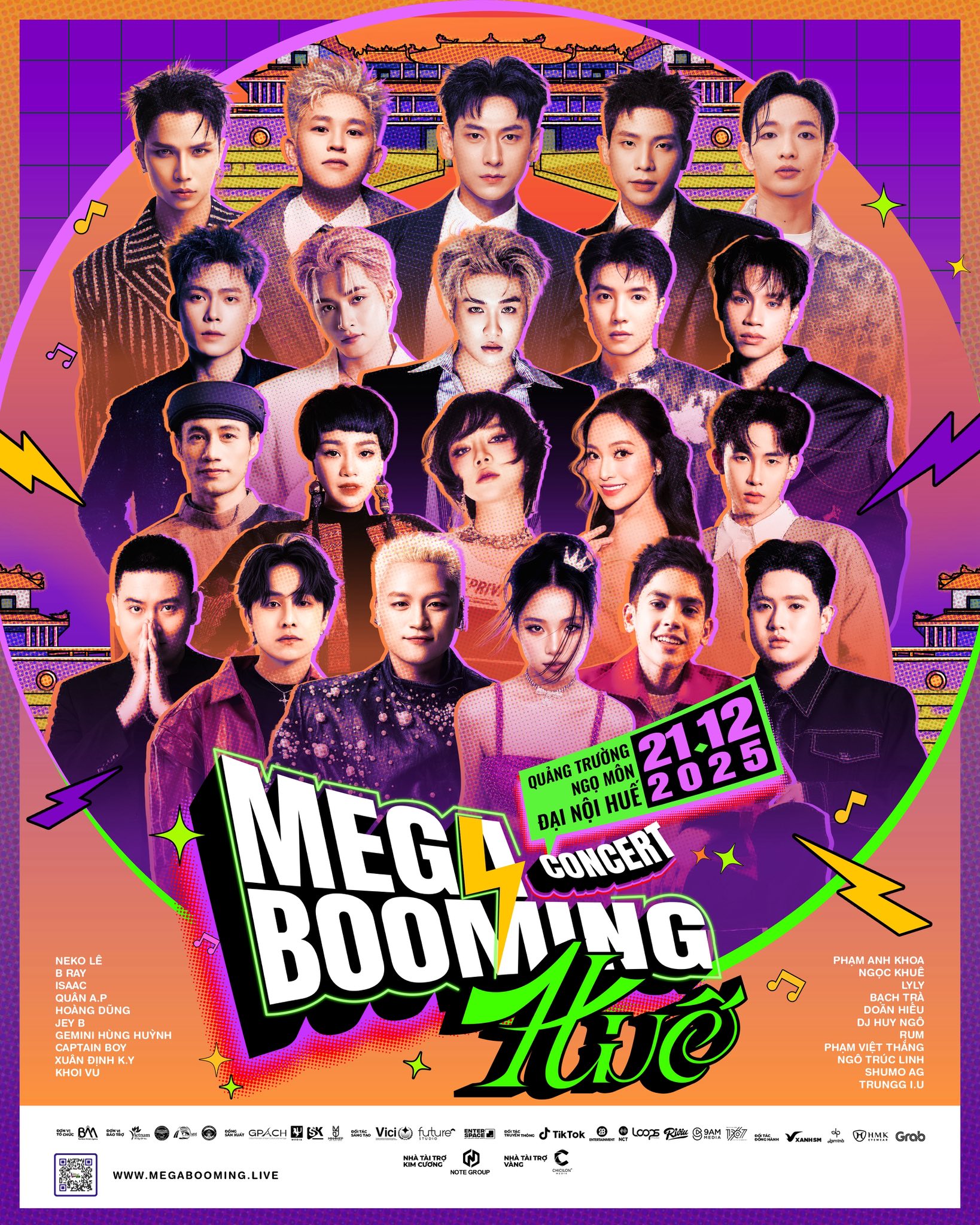 Đại nhạc hội Mega Booming – Day 1 diễn ra vào ngày 6/7/2025 tại quảng trường Ngọ Môn – Đại Nội Huế trong khuôn khổ năm Du lịch quốc gia 2025 tại Huế với hơn 10,000 khán giả tham dự. Là sản phẩm Du lịch Âm nhạc nổi bật của Huế trong năm 2025